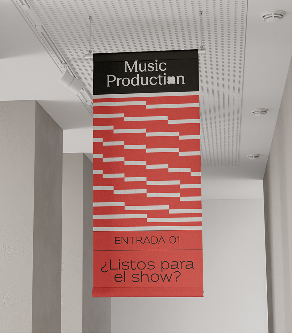 Music Production equilibra profesionalidad y emoción. Una base minimalista en blanco y negro transmite seguridad y solidez, mientras que el rojo aporta energía y carácter. El isotipo, derivado de la “O” del logotipo, simboliza el punto de partida: la vibración y el sonido como origen de cada experiencia. Representa el núcleo de cada evento, el lugar donde todo comienza y desde donde se genera la conexión entre artista y público.
